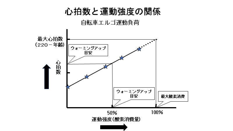 | 筋肉が最大のパーフォーマンスを発揮するには、血圧150mmHg以上が必要である。血圧150mmHgに達する各自の心拍数を運動負荷試験にて知り、心拍数を目安にウォーミングアップを行うことがポイントとなる。 |
